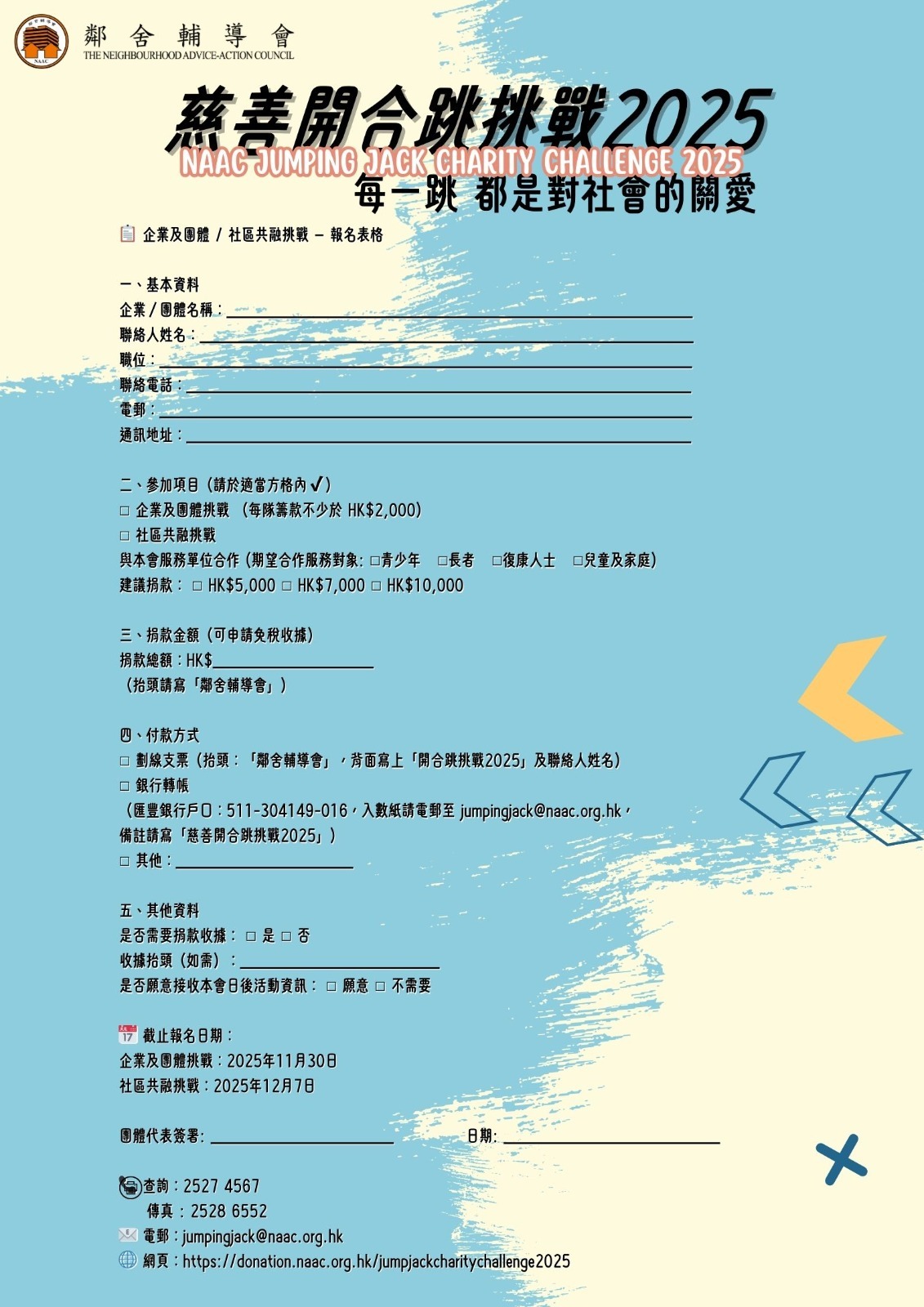 鄰舍輔導會誠邀企業及義工團體參與《慈善開合跳挑戰2025》,透過簡單而富趣味的開合跳運動,推廣全民健身、社區共融及慈善精神。活動旨在響應國家全運會,並為本會非政府資助服務籌募經費。